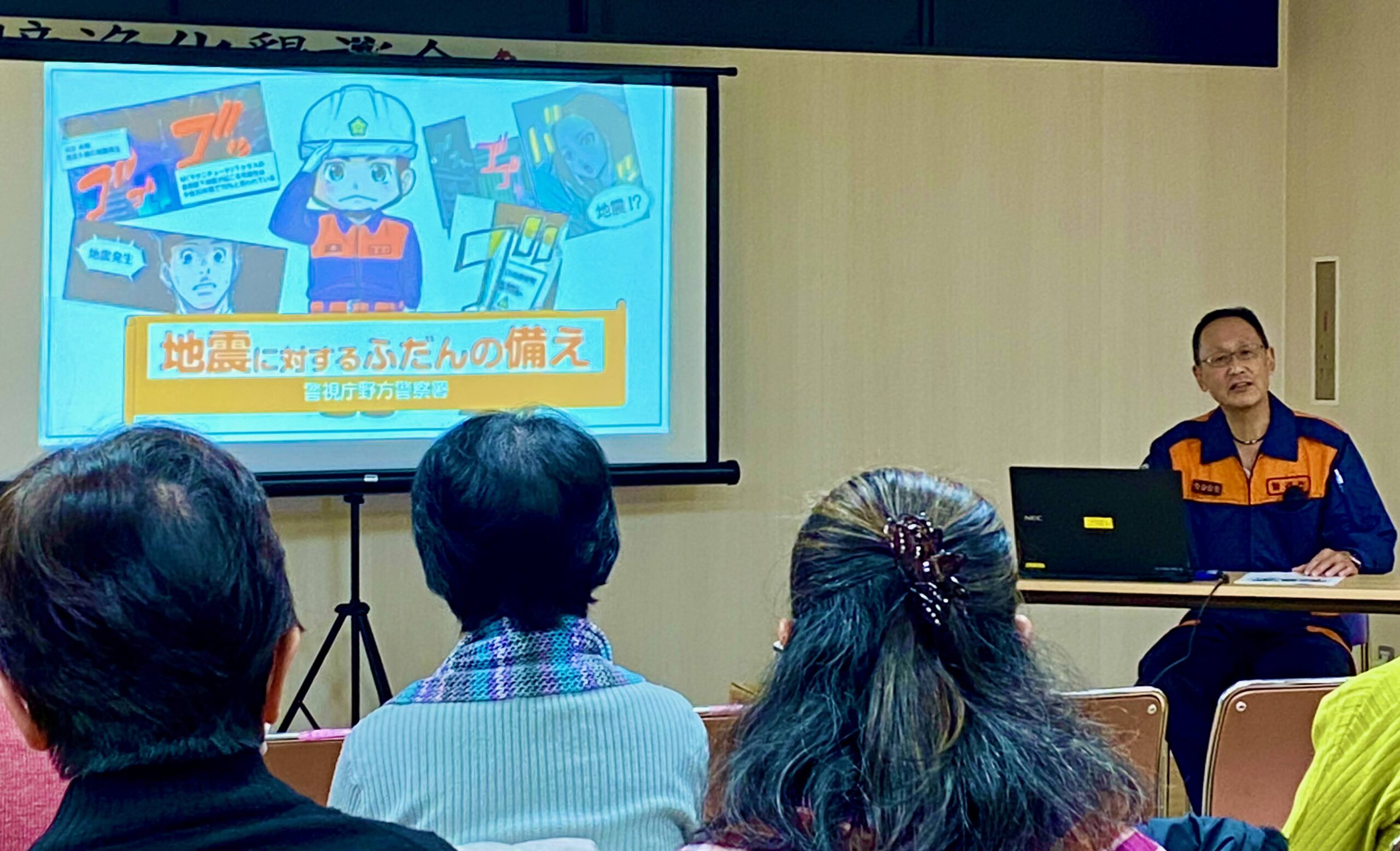 黒須浩之警備係長は警視庁発行の冊子「地震のときはこうしよう!」を元に、特に地震災害時の備えについて講話。「阪神・淡路大震災のときに助かった
