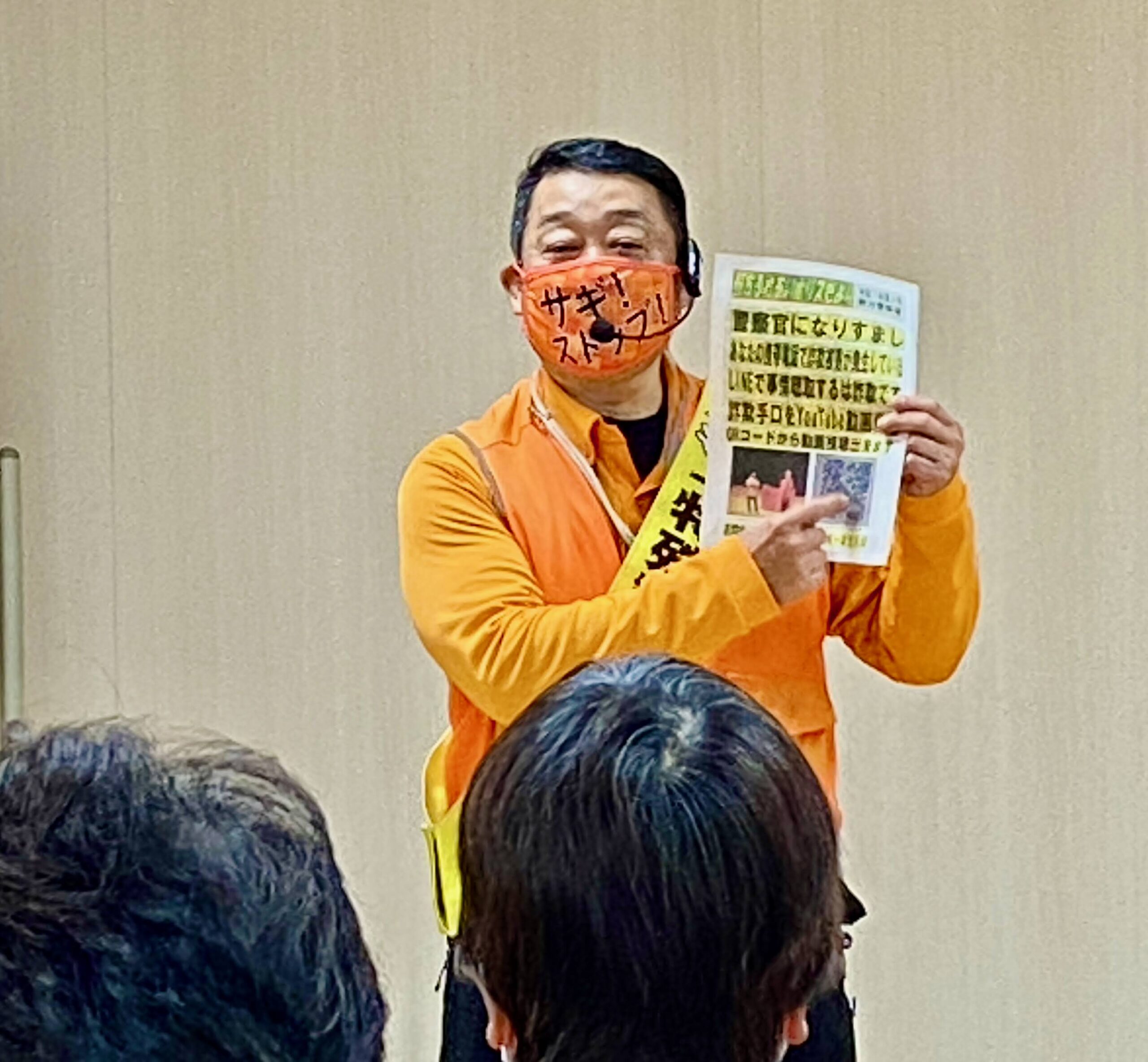 ふれあいポリスの鈴木北九生さんは「サギ ストップ!」と書かれたマスクをして登壇。特殊詐欺被害防止の啓発チラシを手に「昨日までに84件、4億円