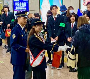 管内の都立蔵前工科高等学校や忍岡高等学校の生徒ら40名以上も参加して駅を利用する乗降客にウエットティッシュなどの啓発グッズを配って痴漢防止を訴えました。
