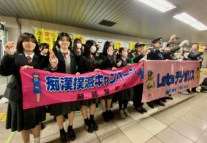 蔵前工科高等学校と忍岡高等学校の生徒たちも痴漢撲滅を訴えて啓発グッズを配っていました。