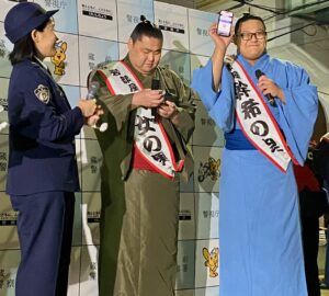 西岩部屋の幹希の里力士と八女の里力士が蔵前署と蔵前工科高等学校の生徒が共同で開発した「Let’sデジポリス」のタグ付きキーホルダーでデジポリスをダウンロードしてアピール。幹希の里力士も「簡単にできました」と笑顔。