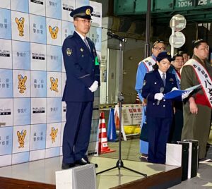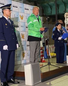 挨拶に立った河野雅明署長は「賑わいに乗じた客引きや看板の路上設置などを放置しないよう環境浄化活動は大事」とキャンペーンの重要性を訴えました。特殊詐欺対策にも触れ、デジポリスに国際電話を止めるアプリが搭載されたことを紹介、デジポリスをダウンロードして、と訴えました。