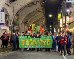蔵前署と同防犯協会は、年末恒例の盛り場対策環境浄化活動を12月19日に開催しました。管内13町会のほか、ビル防犯協力会や近隣企業も参加してJR浅草橋駅西口周辺を環境浄化を訴えてパレードしました。