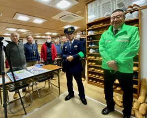 亀有仲町会で出発前の町会メンバーと。右端が平井協会長、制服姿の小山署長。
