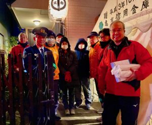 年末恒例の歳末特別警戒の夜警。亀有署と防犯協会が行っている年末警戒激励巡視は、この日(12月26日)に夜警を実施する57の町会・自治会を署長以下幹部と防犯協会役員が7つのコースにわかれて巡視します。夜警出発時間は各町会ともだいたい似るので、巡視はスピード感が大事。激励と慰問の気持ちを伝えながら駆け足で巡ります。署長と協会長の第1コースに同行しました。